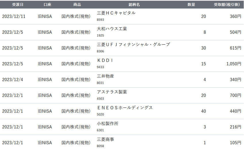 12月は様々な銘柄から配当金が発生しました。